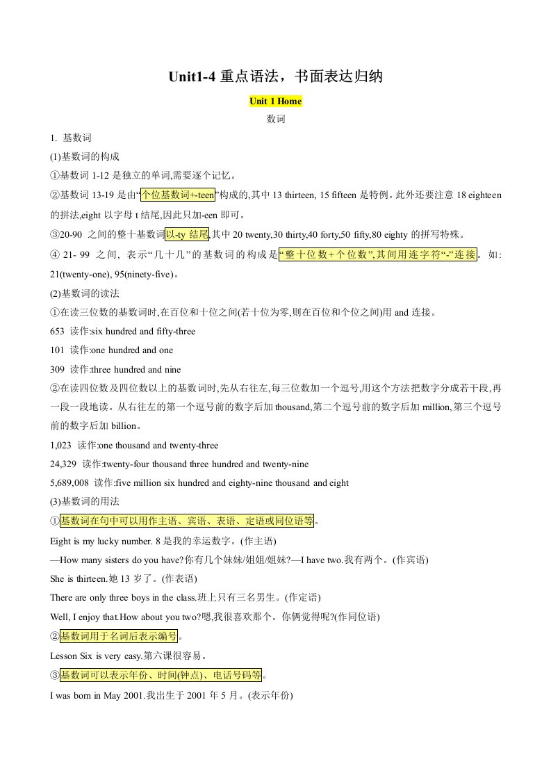 七下英语译林 考点清单02 Unit1-4重点语法,书面表达归纳(含答案)