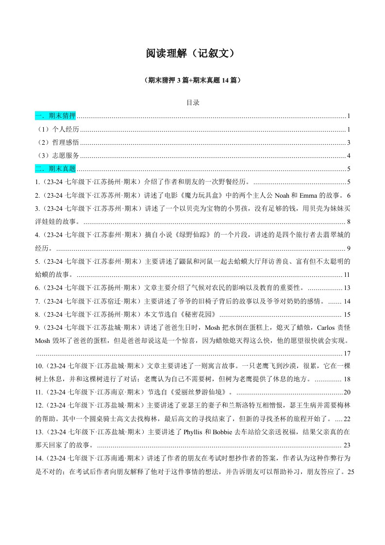 七下英语 译林 专题05 阅读理解(记叙文) (期末必刷17篇)(含答案)QXYYYL-0518