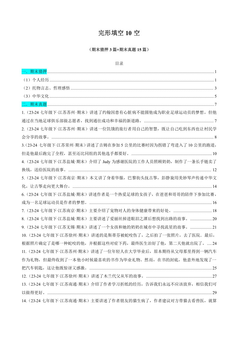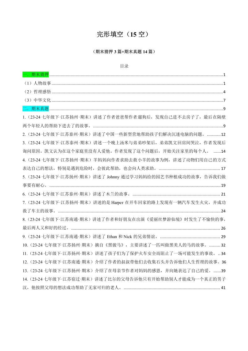 七下英语 译林 专题03 完形填空(15空) (期末必刷17篇)(含答案)QXYYYL-0514