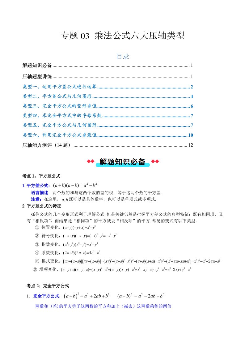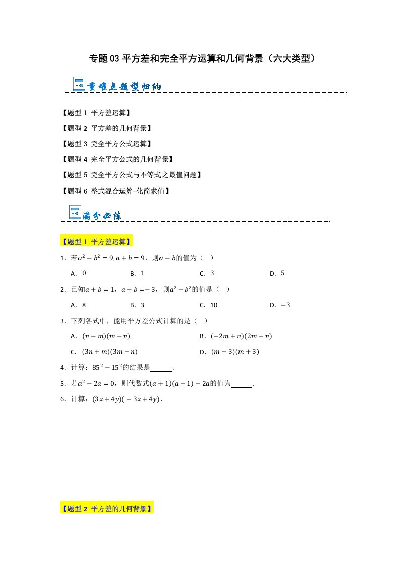 七下数学苏科 专题03 平方差和完全平方运算和几何背景(六大类型)(含答案)QXSXSK-0141