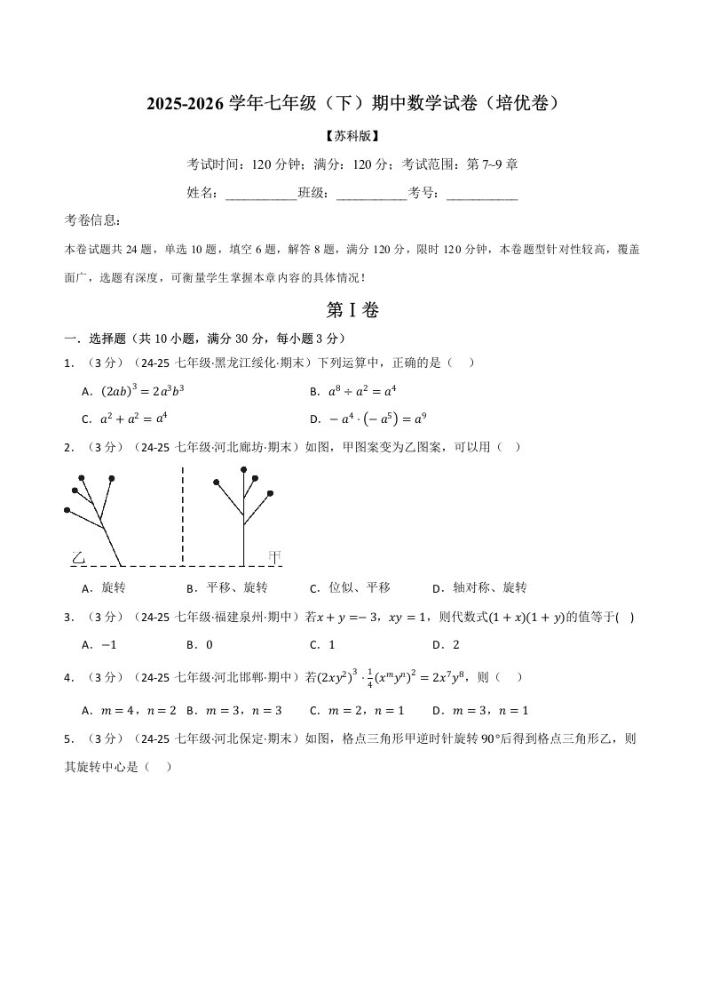 七年级(下)期中数学试卷(考查范围:第7~9章)(苏科版)(含答案)QXSXSK-0201