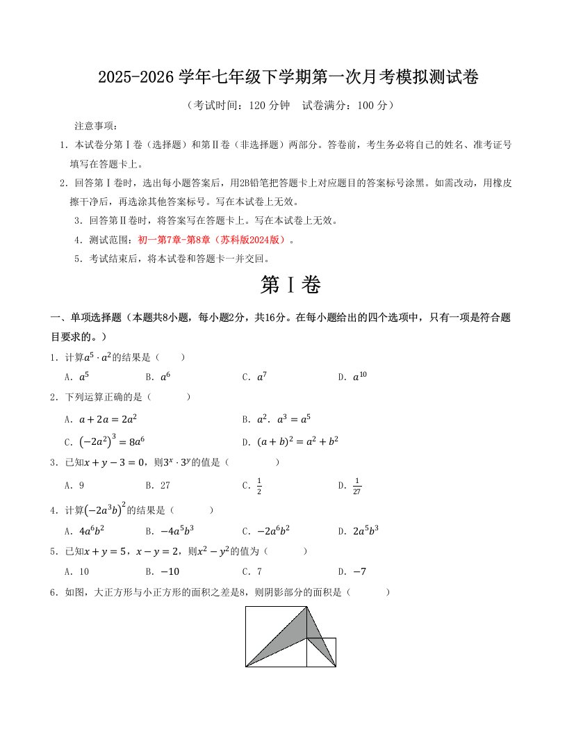 七年级下学期第一次月考模拟测试卷(苏科版)(含答案)QXSXSK-0184