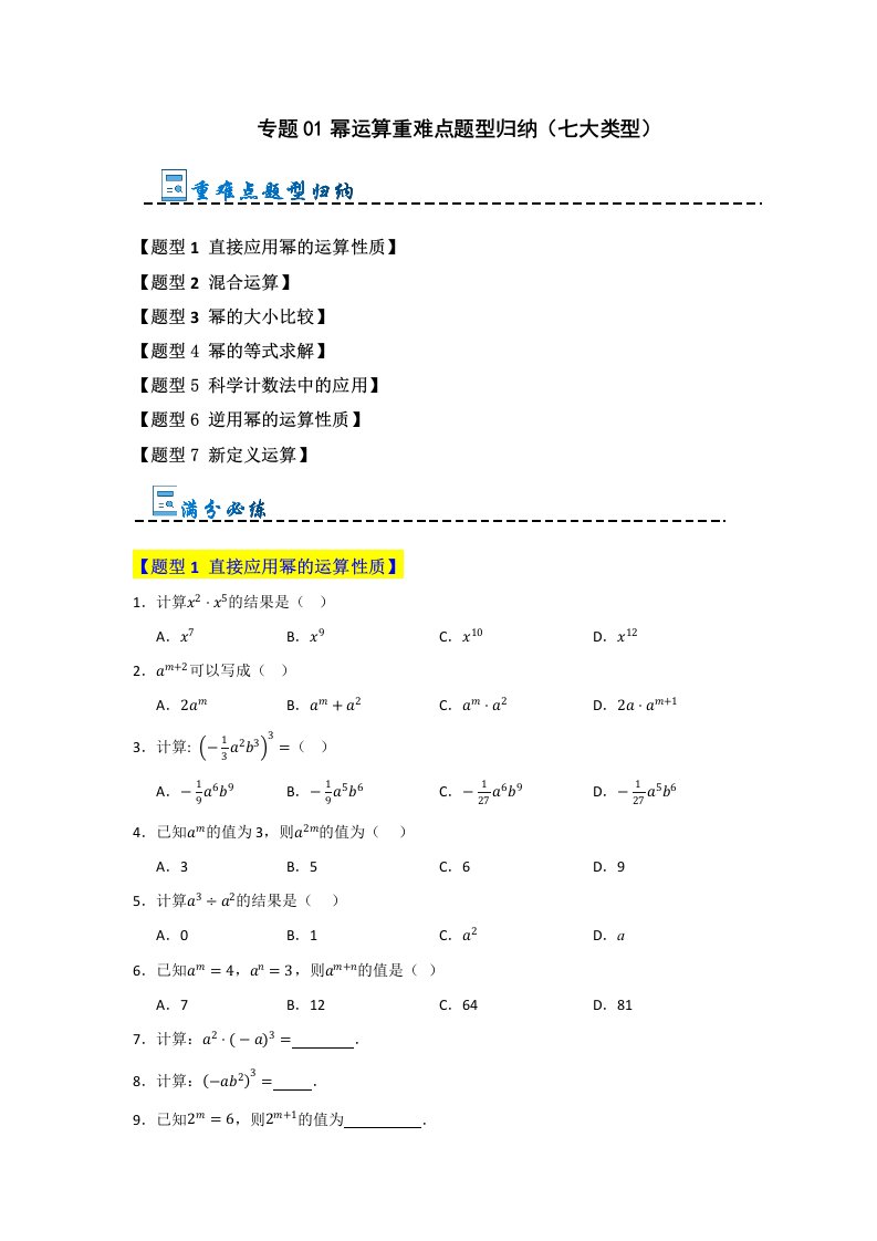 七下数学苏科 专题01 幂运算重难点题型归纳(七大类型)(含答案)QXSXSK-0137