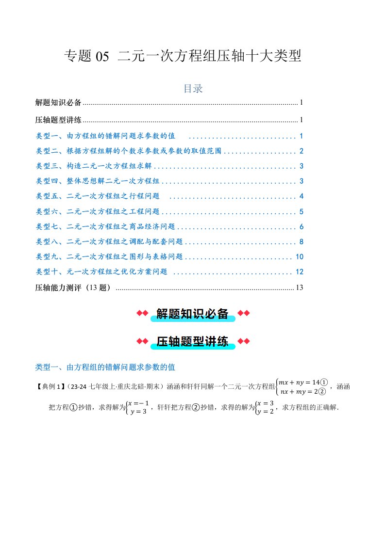 七下数学苏科 专题05 解二元一次方程组与含参数的二元一次方程组(八大题型)(含答案)QXSXSK-0145