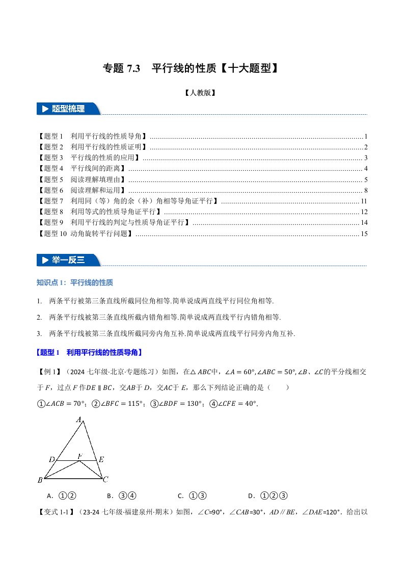 七下数学专题7.3 平行线的性质(十大题型)(人教版)(含答案)QXSXRJ-0108
