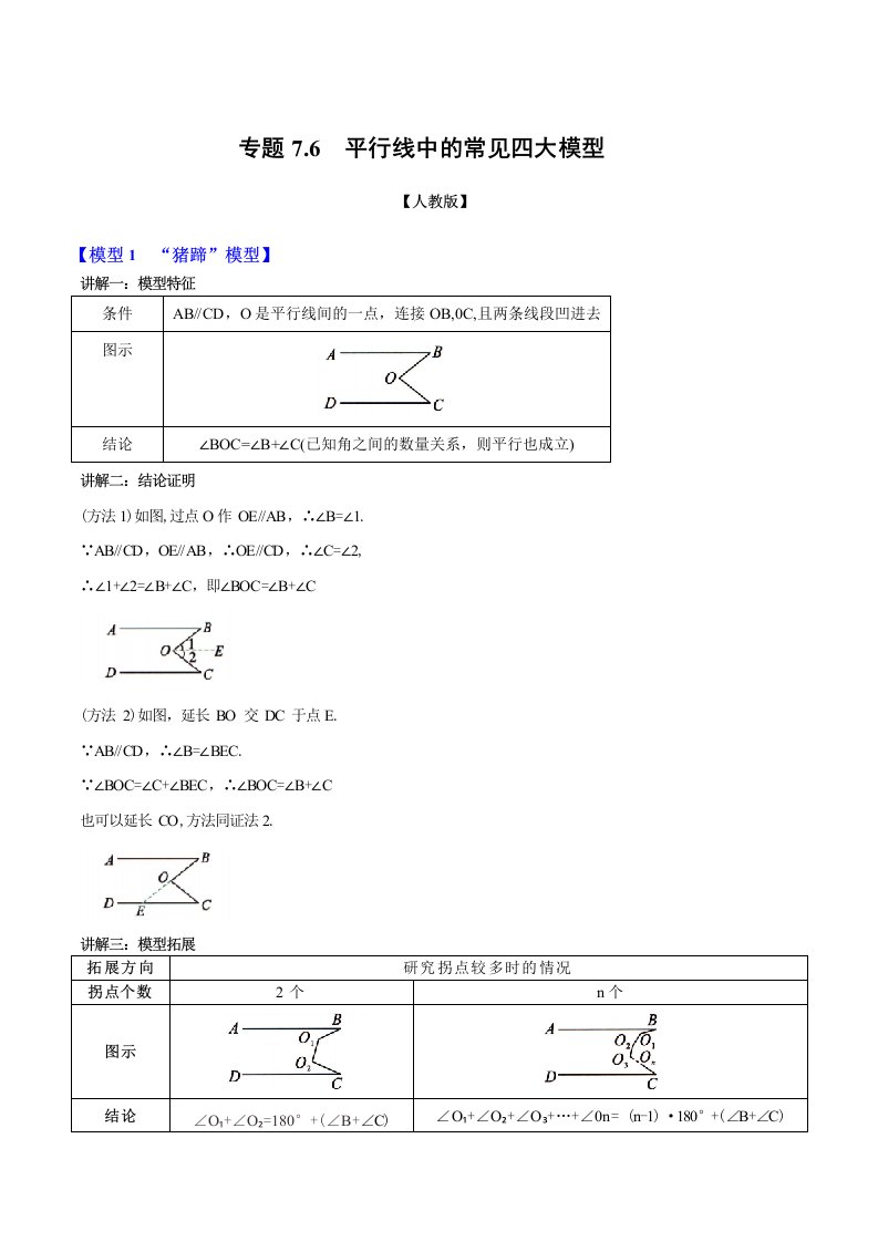 七下数学 专题7.6 平行线中的常见四大模型(人教版)(学生版)(含答案)QXSXRJ-0114