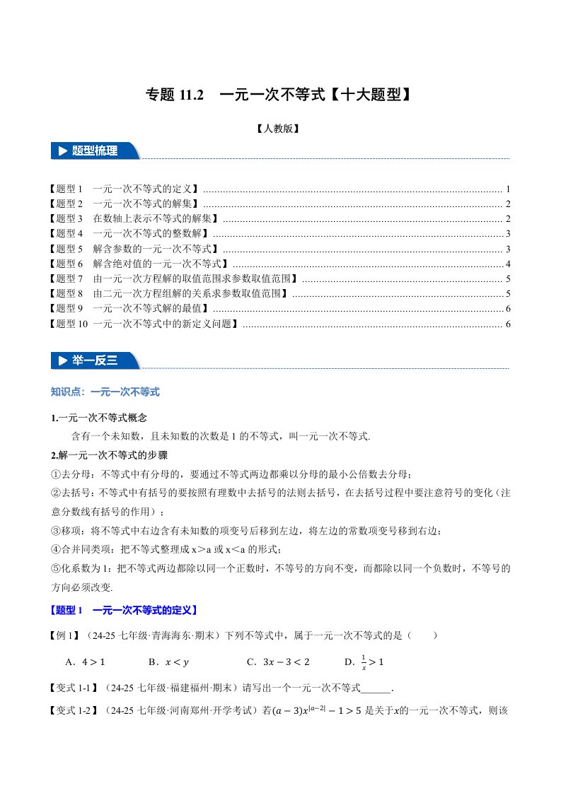 七下数学专题11.2 一元一次不等式(十大题型)(人教版)(含答案)QXSXRJ-0084