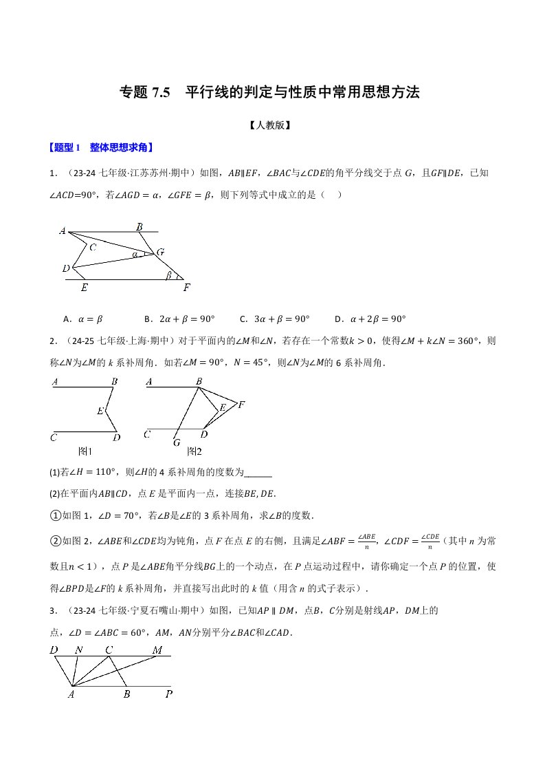 七下数学 专题7.5 平行线的判定与性质中常用思想方法(人教版)(含答案)QXSXRJ-0112