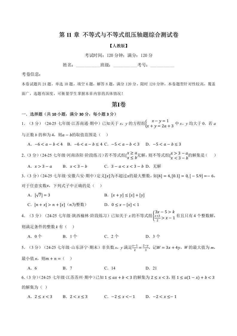 七下数学专题11.9 不等式与不等式组压轴题综合测试卷(人教版)(含答案)QXSXRJ-0098