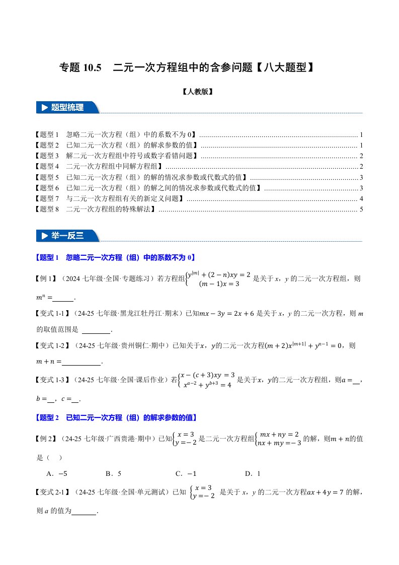 七下数学专题10.5 二元一次方程组中的含参问题(八大题型)(人教版)(含答案)QXSXRJ-0074