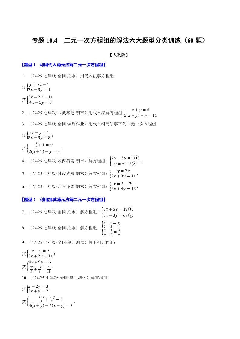 七下数学专题10.4 二元一次方程组的解法六大题型分类训练(60题)(人教版)(含答案)QXSXRJ-0072