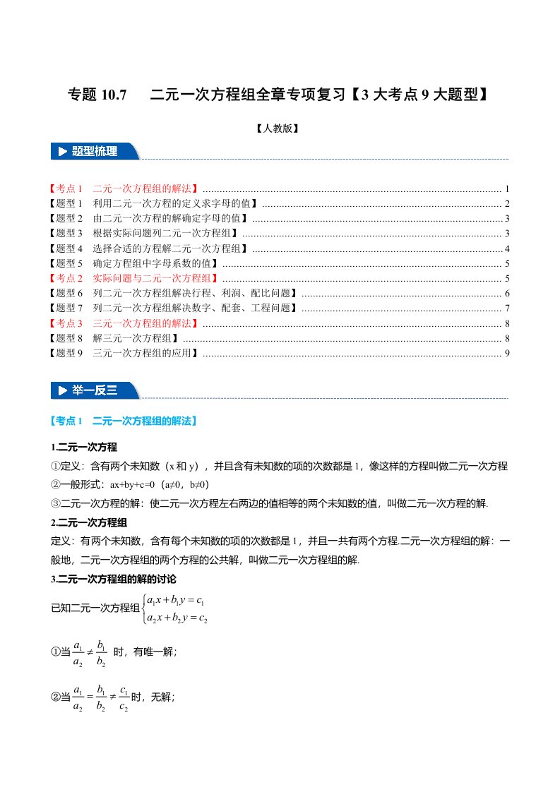 七下数学专题10.7 二元一次方程组全章专项复习(3大考点9大题型)(人教版)(含答案)QXSXRJ-0078