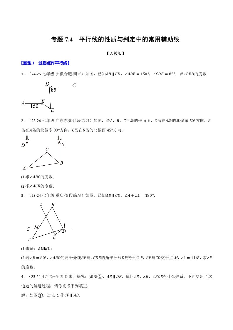 七下数学 专题7.4 平行线的性质与判定中的常用辅助线(人教版)(含答案)QXSXRJ-0110