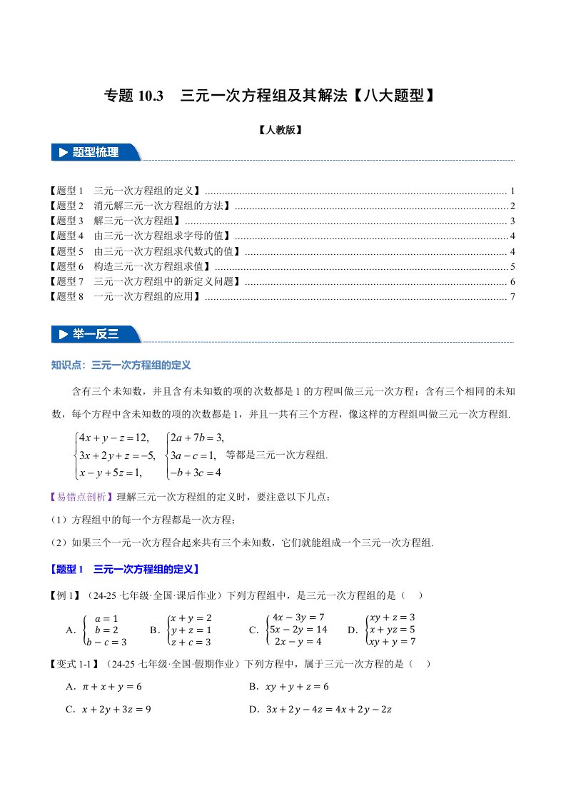 七下数学专题10.3 三元一次方程组及其解法(八大题型)(人教版)(含答案)QXSXRJ-0070