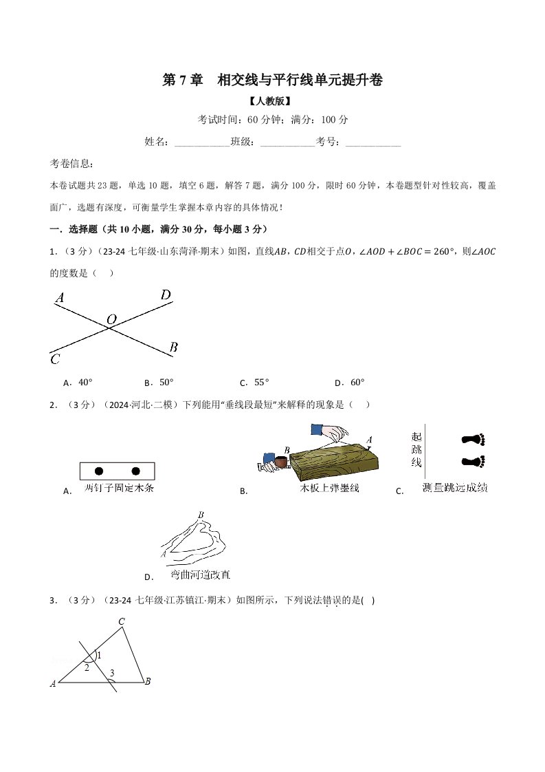 七下数学 专题7.7 相交线与平行线单元提升卷(人教版)(含答案)QXSXRJ-0116