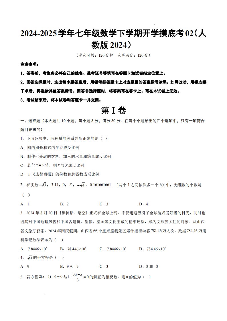 七年级数学开学摸底考02(人教版)(含答案)QXSXRJ-0250