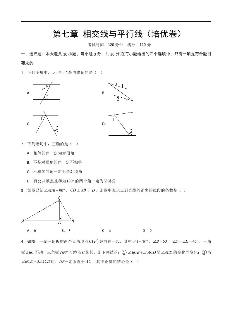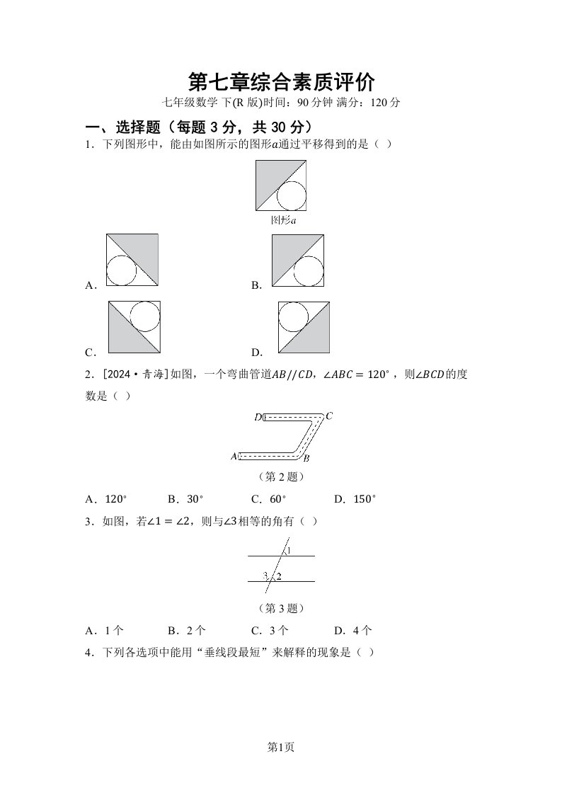 七下数学 第七章 相交线与平行线(含答案)QXSXRJ-0026