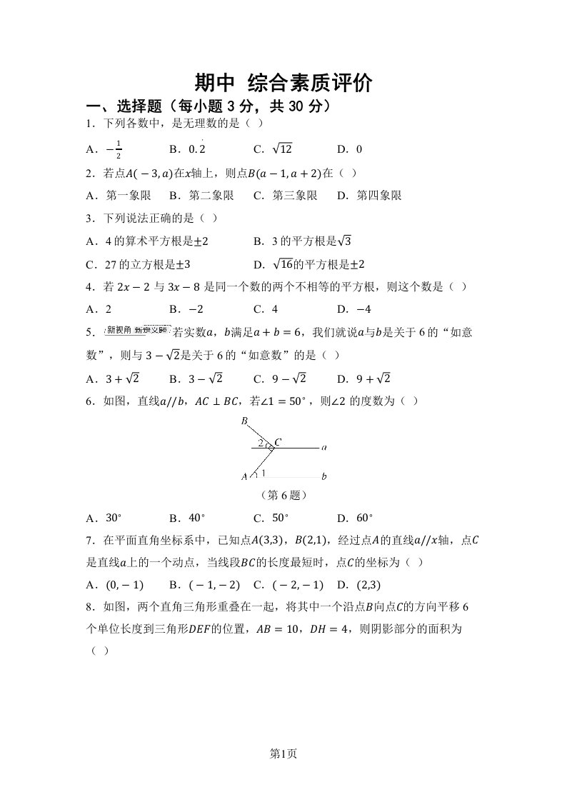 七下数学期中 综合素质评价(含答案)QXSXRJ-0015