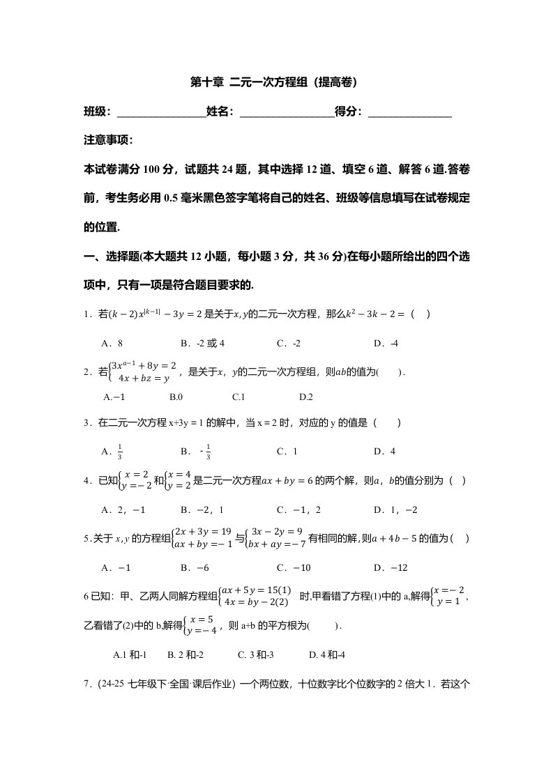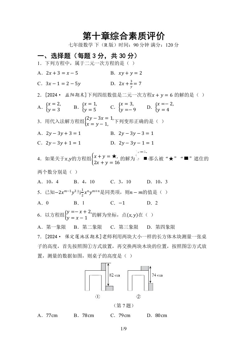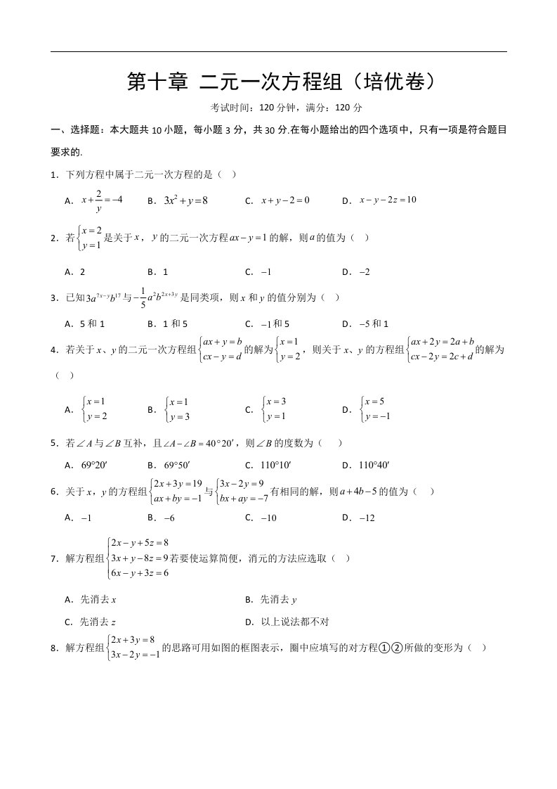 七下数学 第十章 二元一次方程组单元测试卷(含答案)QXSXRJ-0050