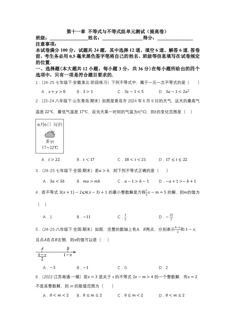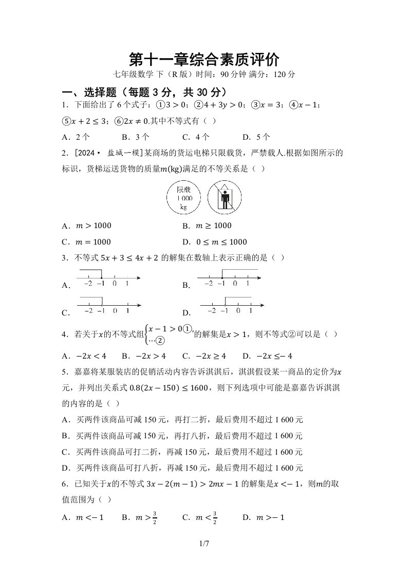 七下数学 第十一章 不等式与不等式组单元测试(含答案)QXSXRJ-0046