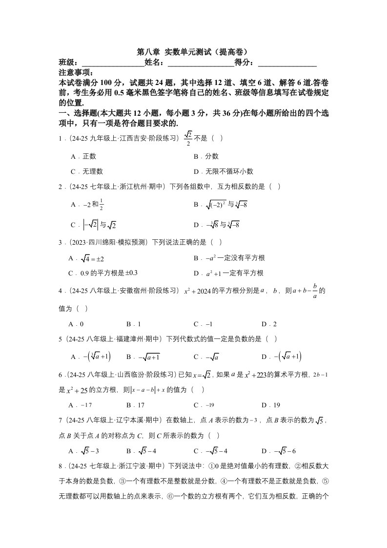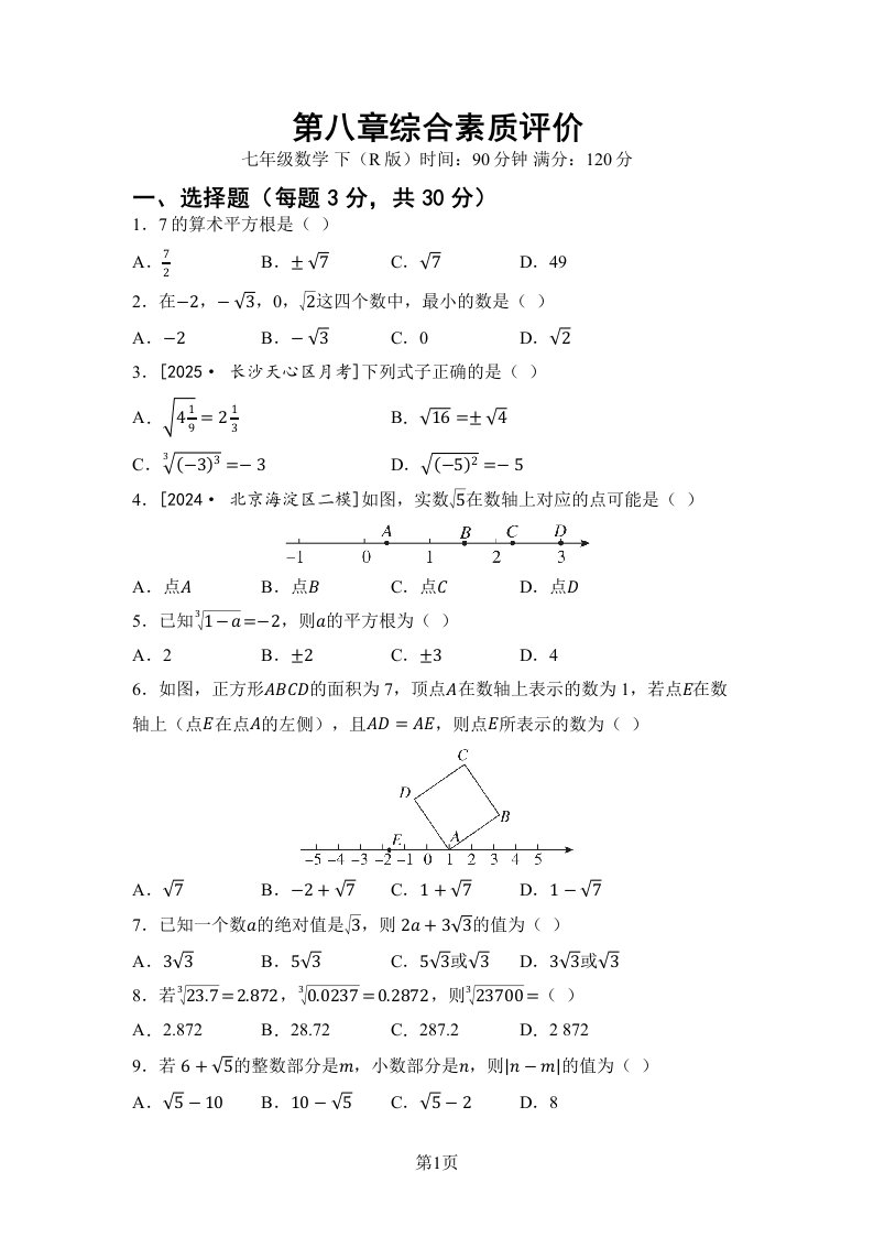 七下数学 第八章 实数单元测试(含答案)QXSXRJ-0044