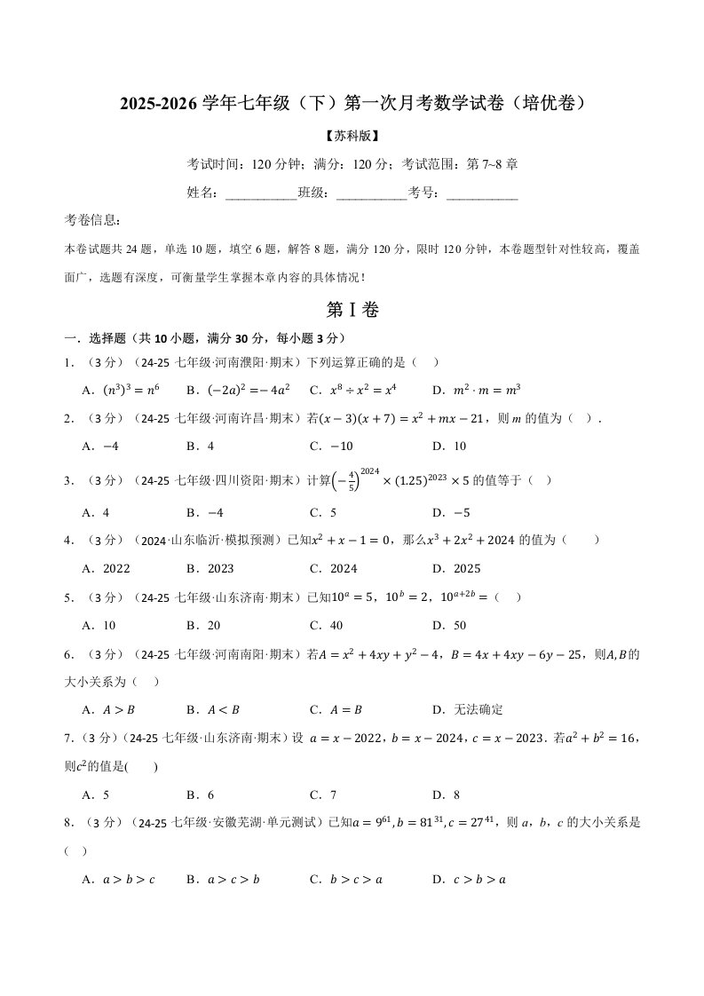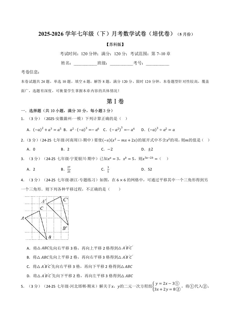 七年级(下)第一次月考数学试卷(3月份)(考查范围:第7~8章)(苏科版)(含答案)QXSXSK-0186