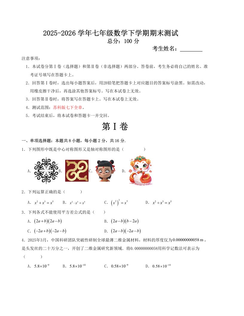 七年级(下)期中数学试卷(考查范围:第7~9章)(苏科版)(含答案) QXSXSK-0204