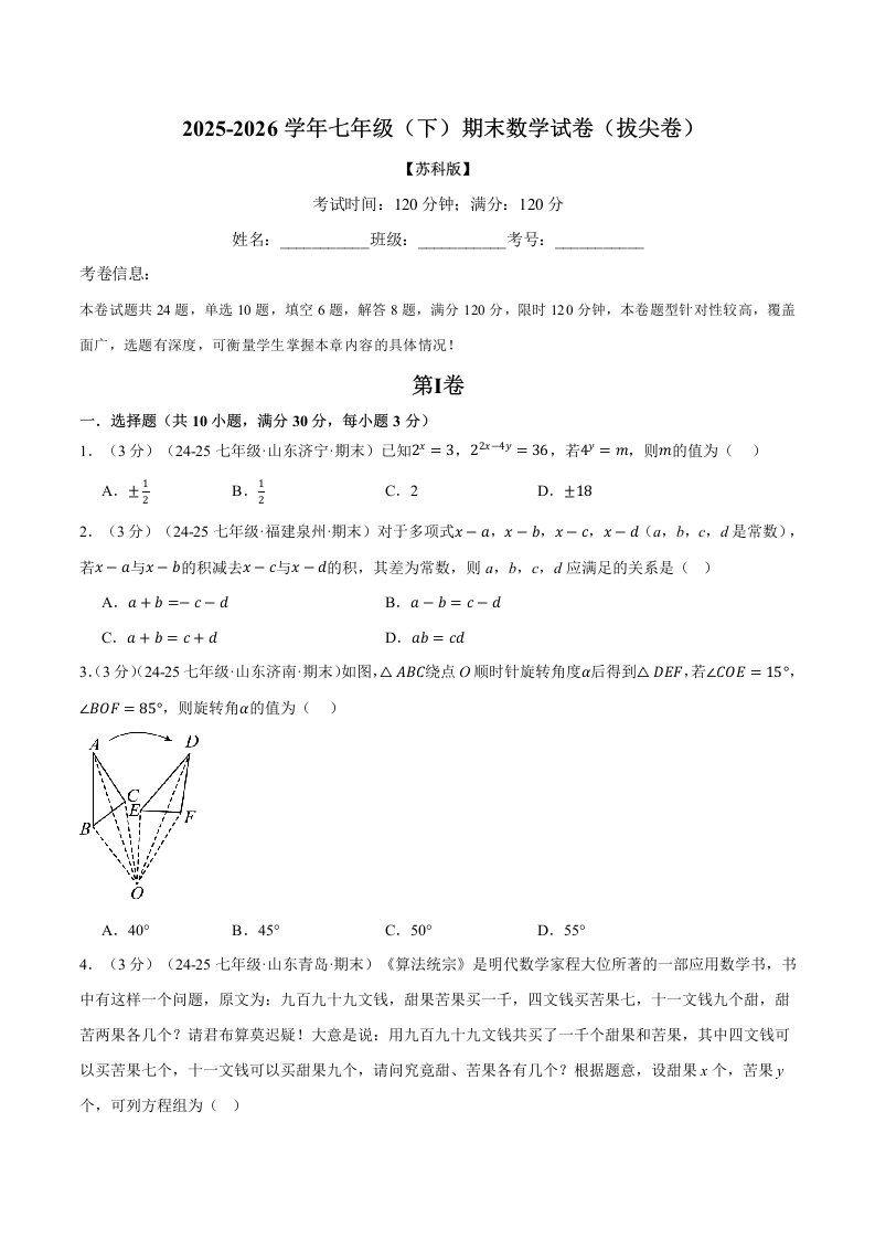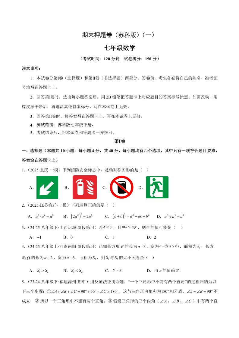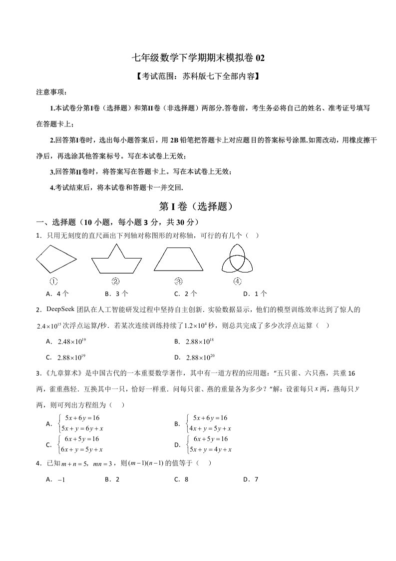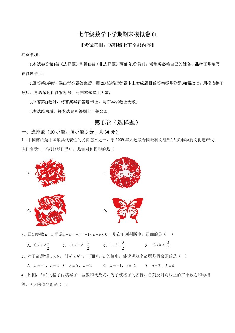 七年级数学苏科下期末模拟卷01(考试范围:苏科版七下全部内容)(含答案)QXSXSK-0222