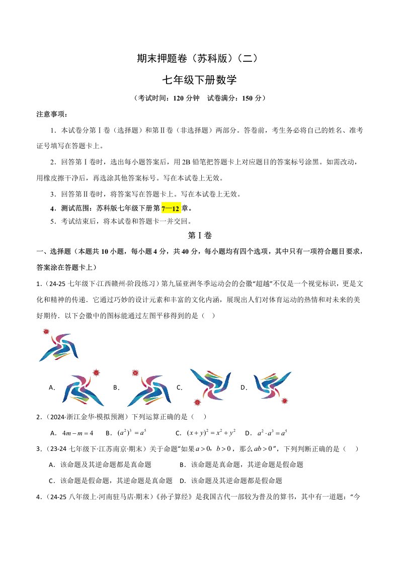 七下数学期末押题卷(苏科版)(含答案)QXSXSK-0210