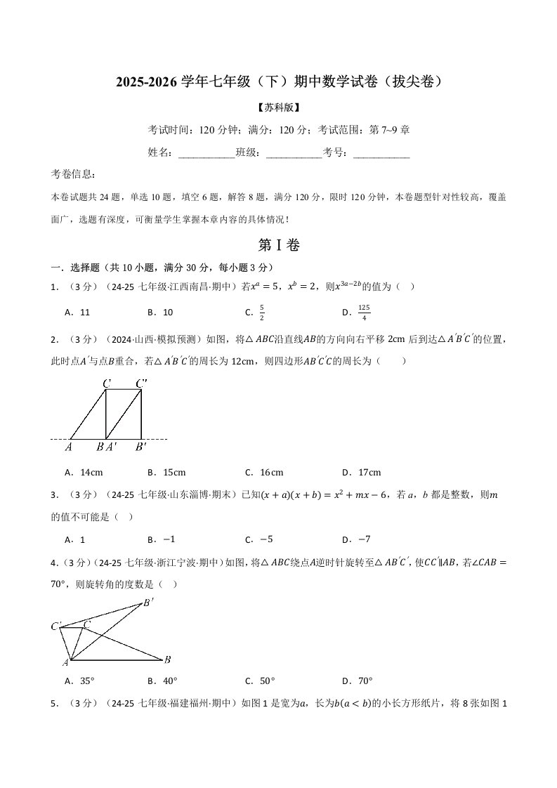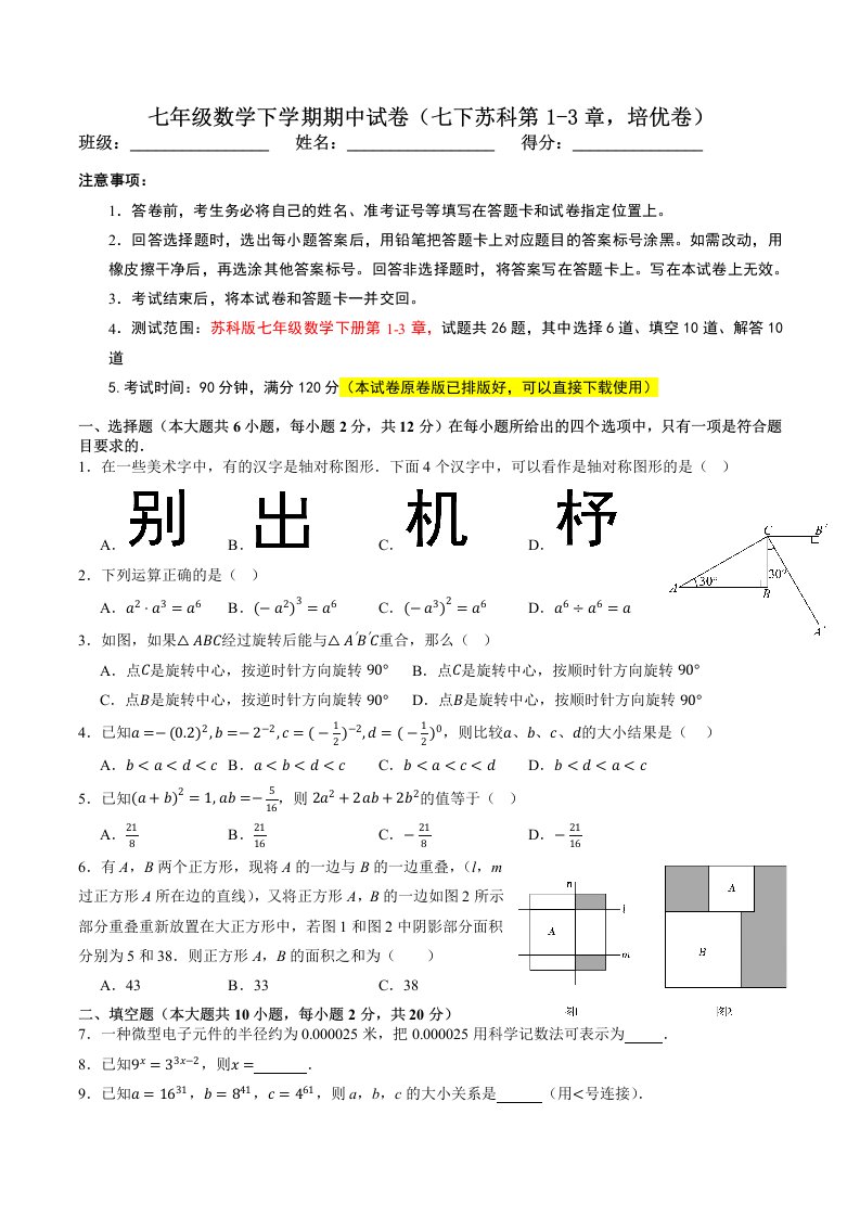 七年级数学苏科下学期期中试卷(七下苏科第1-3章,培优卷)(含答案)QXSXSK-0197