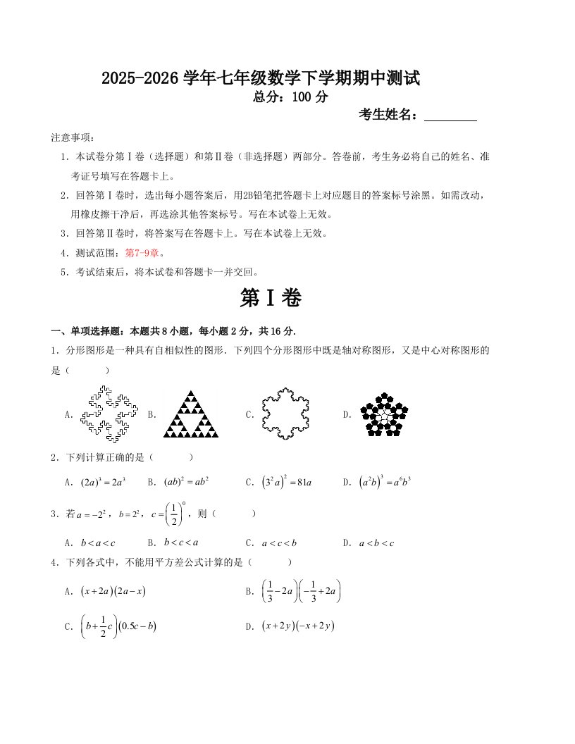七年级(下)期中数学试卷(考查范围:第7~9章)(苏科版)(含答案)QXSXSK-0201