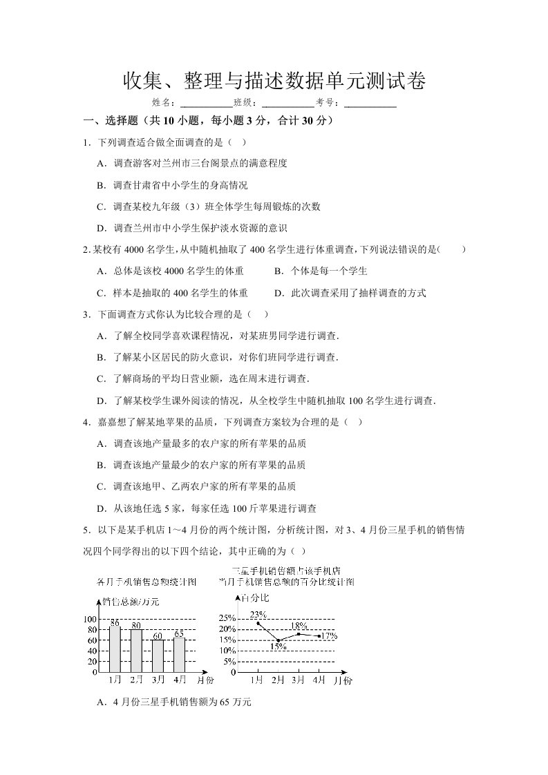 七下数学湘教第6章 收集、整理与描述数据 单元测试卷(含答案)QXSXXJ-0079