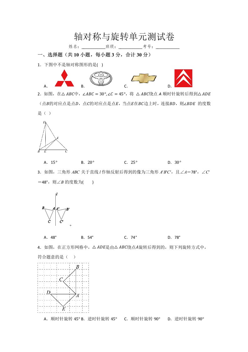 七下数学湘教 第5章 轴对称与旋转 单元测试卷(含答案)QXSXXJ-0077