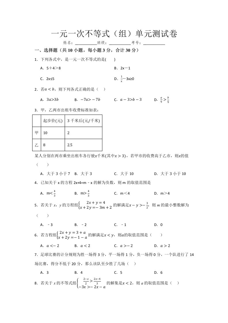 七下数学湘教 第3章 一元一次不等式(组)单元测试卷(含答案)QXSXXJ-0073