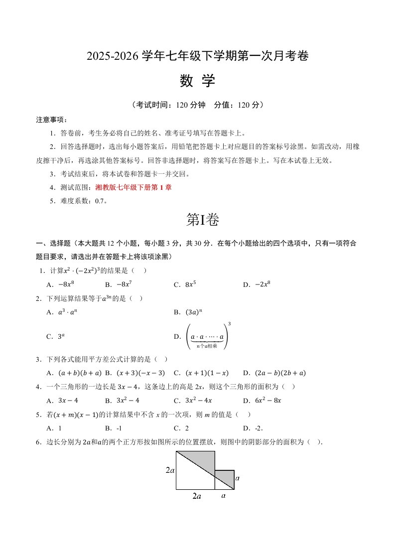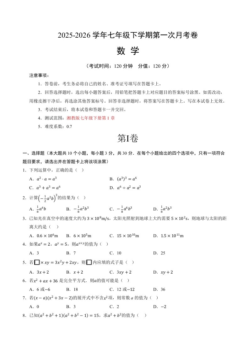 七年级数学月考卷【测试范围:湘教版七年级下册第1章】(含答案)QXSXXJ-0206