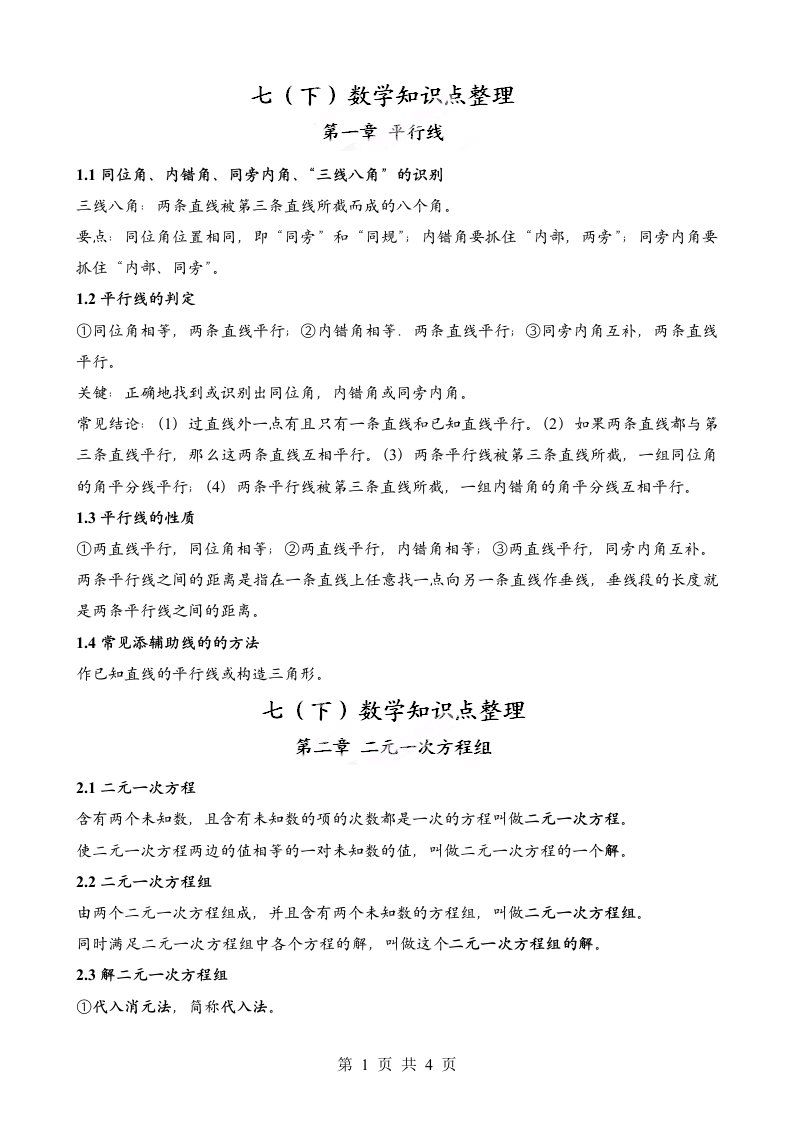 寒假预习-七下数学浙教版知识点总结(记忆版)QXSXZJ-0342