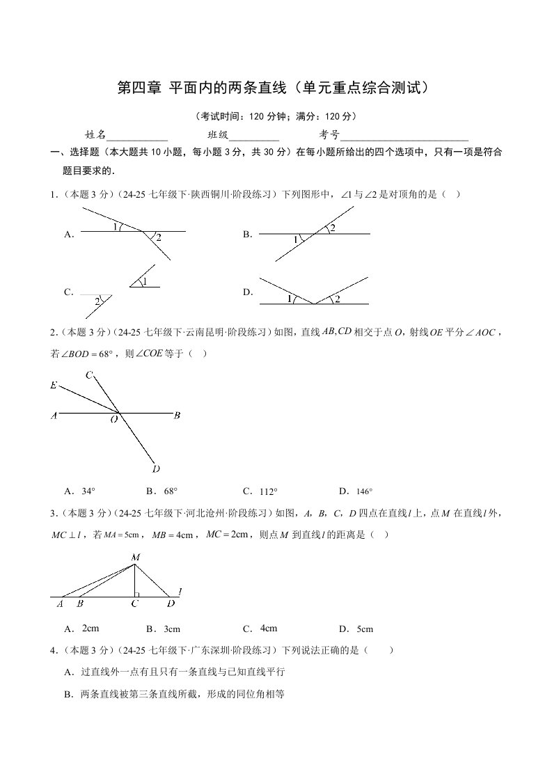 七下数学湘教 第四章 平面内的两条直线单元测试卷(含答案)QXSXXJ-0105