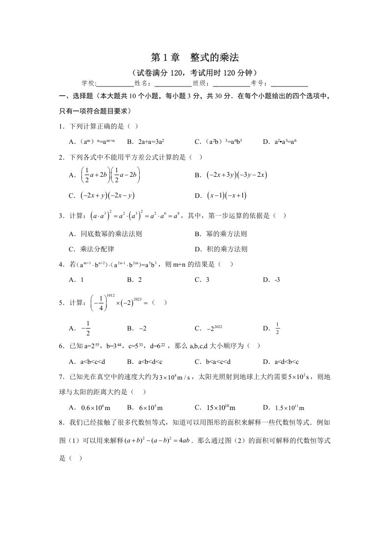 七下数学湘教 第一章 整式的乘法单元测试卷(含答案)QXSXXJ-0095