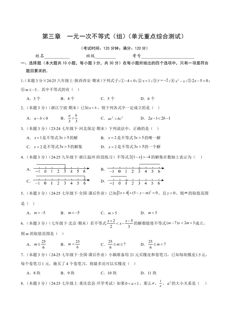 七下数学湘教 第三章 一元一次不等式(组)单元测试卷(含答案)QXSXXJ-0097