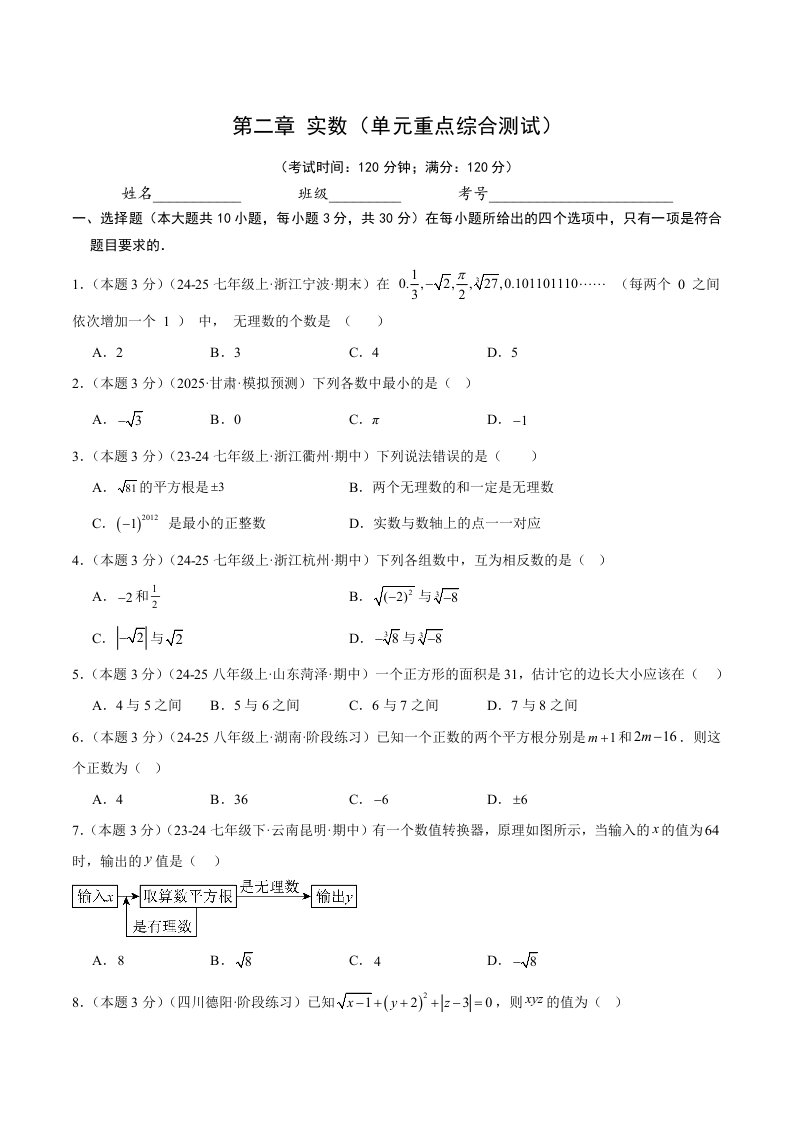 七下数学湘教 第2章 实数单元测试卷(含答案)QXSXXJ-0071