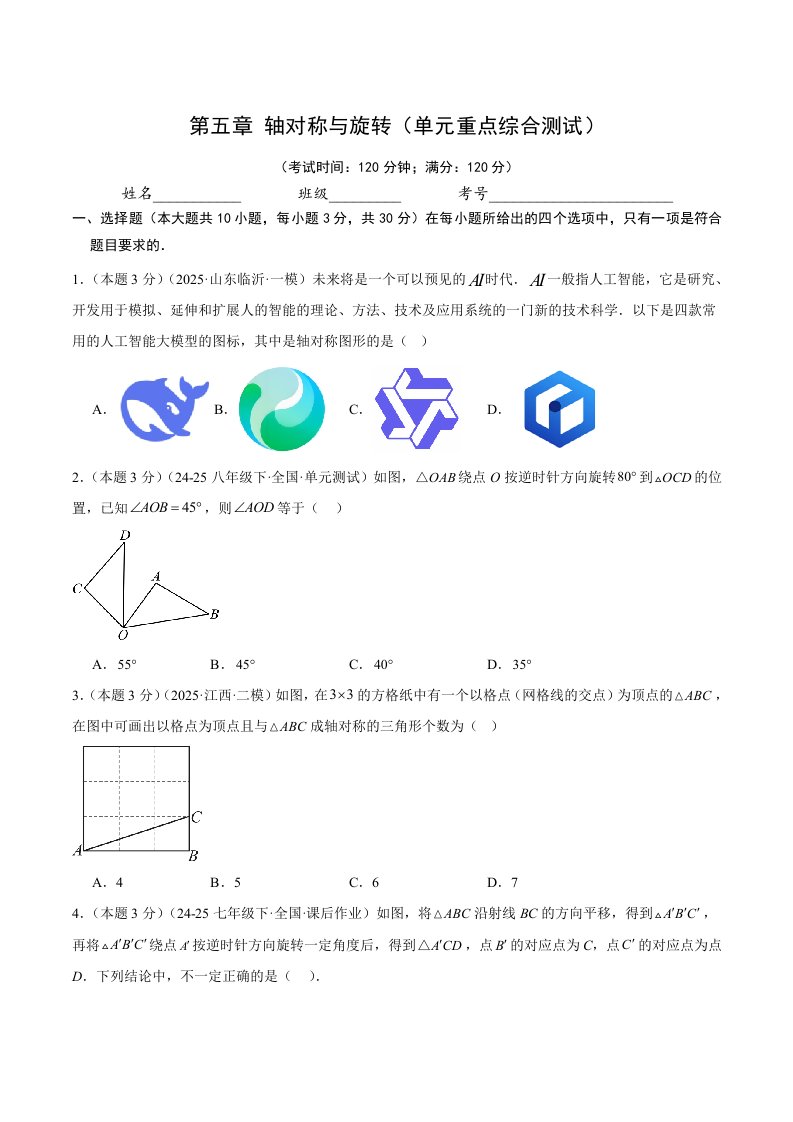 七下数学湘教 第五章 轴对称与旋转单元测试卷(含答案)QXSXXJ-0101