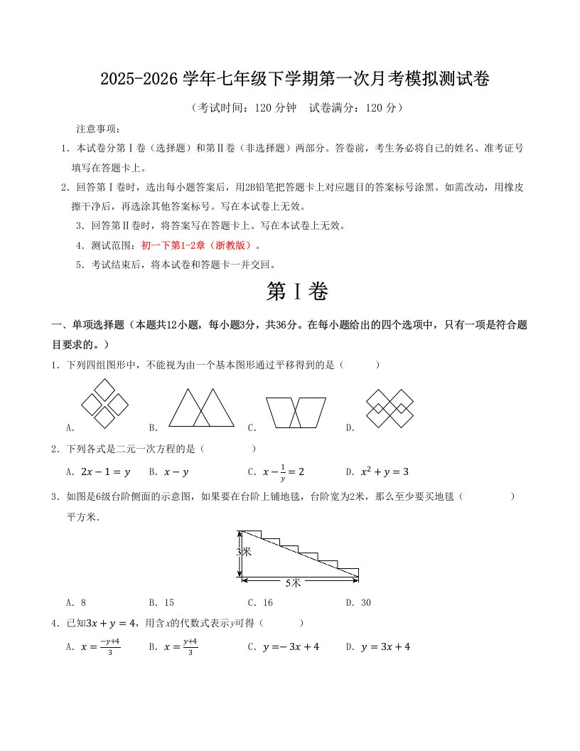 七年级数学下学期第一次月考模拟测试卷(浙教版)(含答案)QXSXZJ-0259