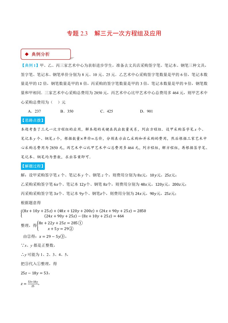 七下数学 专题2.3 解三元一次方程组及应用(压轴题专项讲练)(浙教版)(含答案)QXSXZJ-0236
