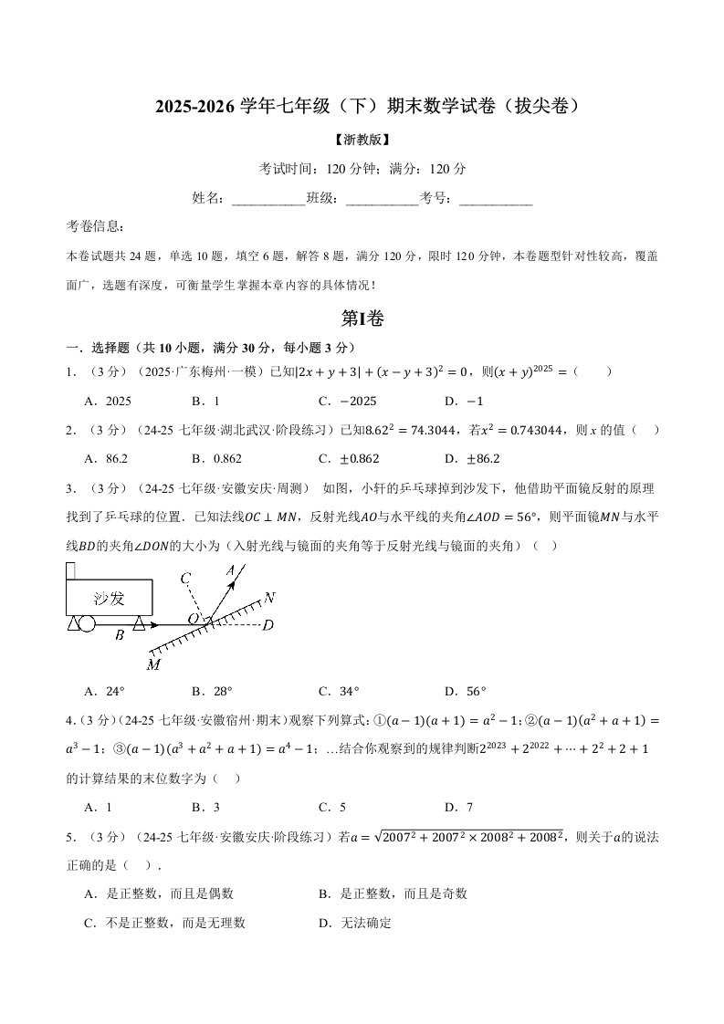 七年级(下)期末数学试卷(拔尖卷)(浙教版)(含答案) QXSXZJ-0284