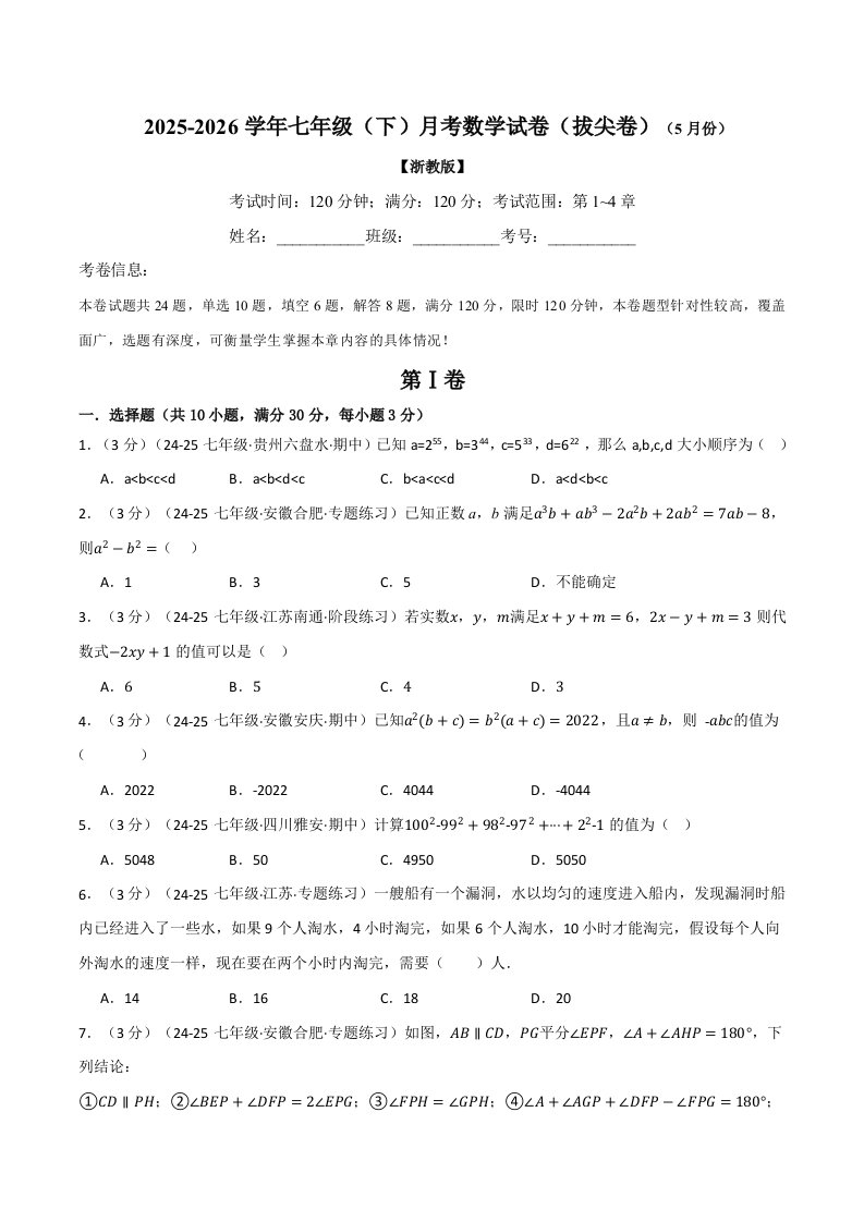 七年级(下)月考数学试卷(5月份)(拔尖卷)(考查范围:第1~4章)(浙教版)(含答案)QXSXZJ-0268