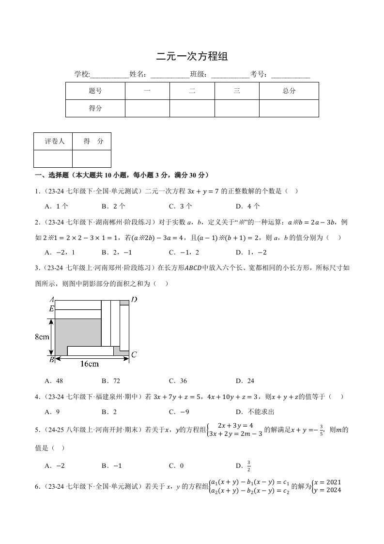 七下数学 专题2.1 二元一次方程(组)及其解法(十一大题型总结)(压轴题专项讲练)(浙教版)(含答案)QXSXZJ-0232