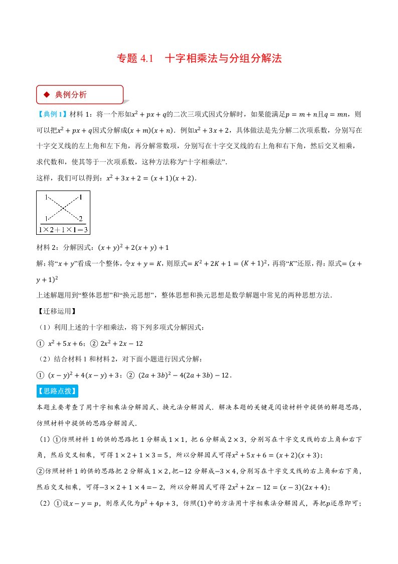 七下数学 专题4.1 十字相乘法与分组分解法(压轴题专项讲练)(浙教版)(含答案)QXSXZJ-0248