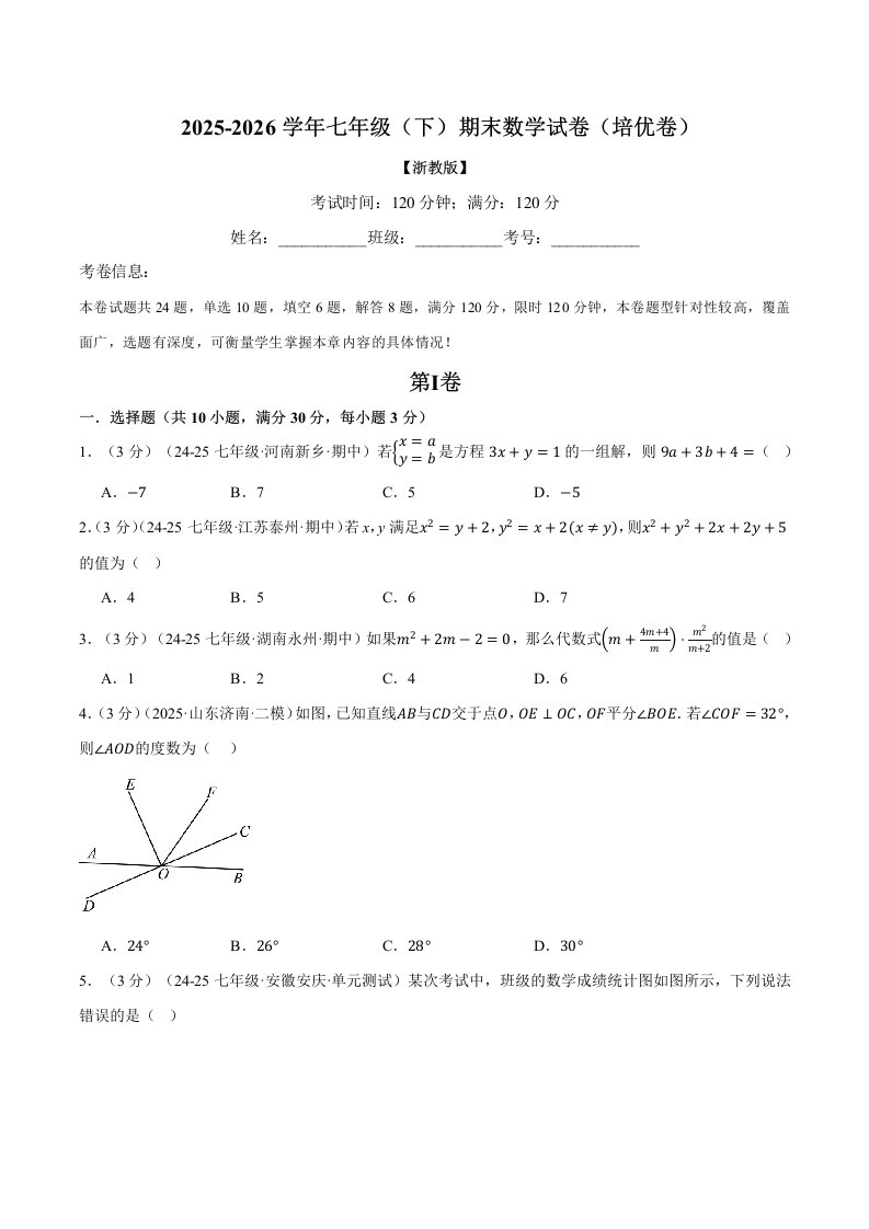 七年级(下)期末数学试卷(培优卷)(浙教版)(含答案)QXSXZJ-0282
