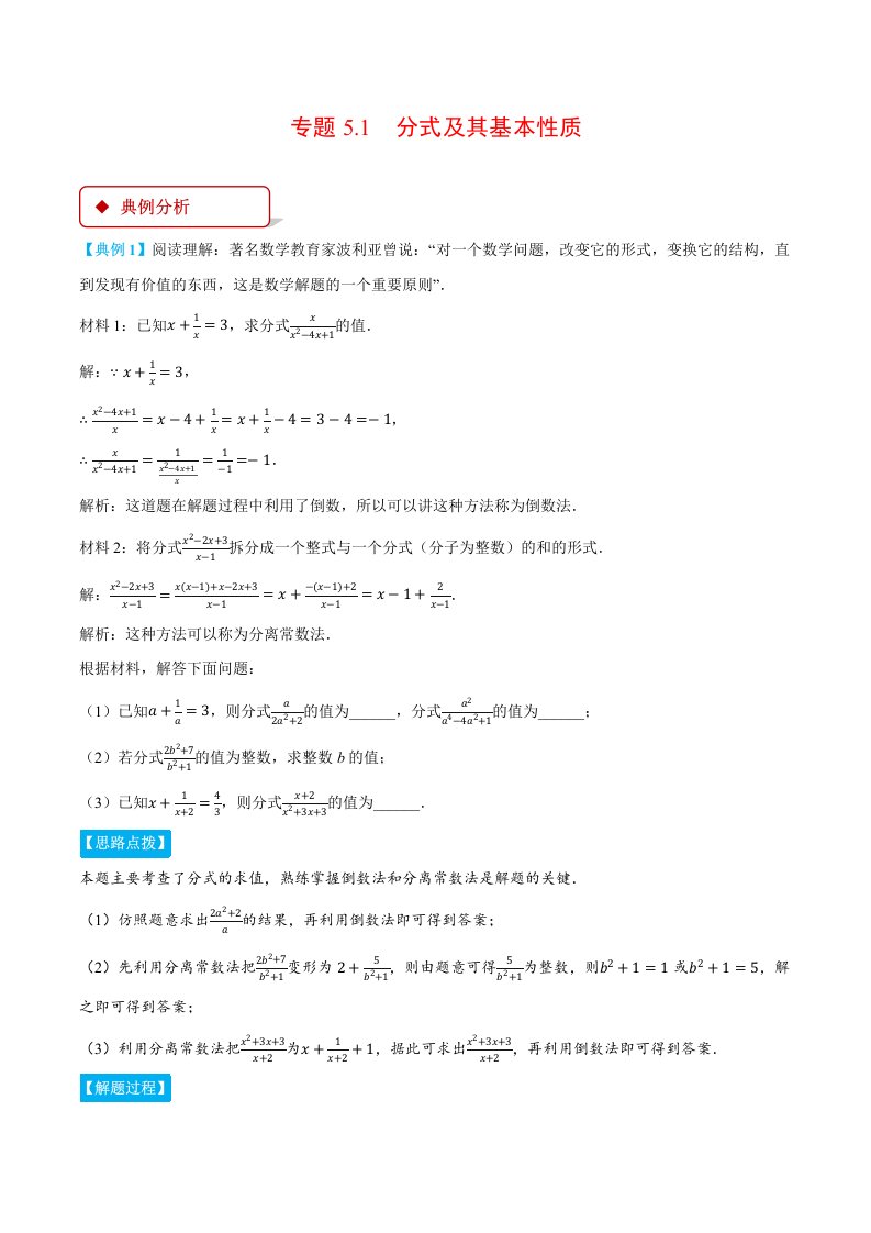七下数学 专题5.1 分式及其基本性质(压轴题专项讲练)(浙教版)(含答案)QXSXZJ-0252