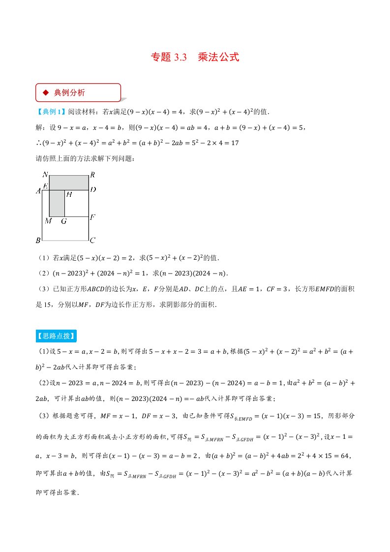 七下数学 专题3.3 乘法公式(压轴题专项讲练)(浙教版)(含答案)QXSXZJ-0244